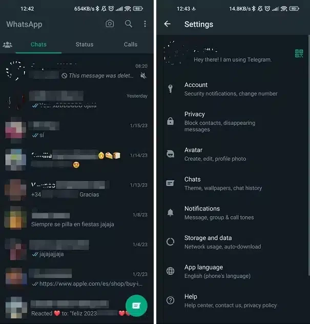 Puedes ver el estado en línea de tu contacto. Esto facilita la conexión, ya que puedes llamarlo o enviarle un mensaje para obtener una respuesta rápida si está conectado. Si no está conectado, también puedes consultar su última conexión. También puedes ver las actividades de tu contacto, como escribir o grabar audio, en la parte superior de la pantalla de chat. Asimismo, te informa sobre el envío, la recepción y la lectura del destinatario. Puedes desactivar la opción "Confirmaciones de lectura" y el estado activo desde la configuración de la aplicación.